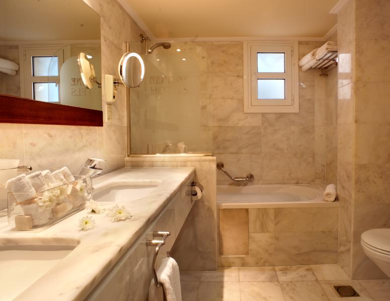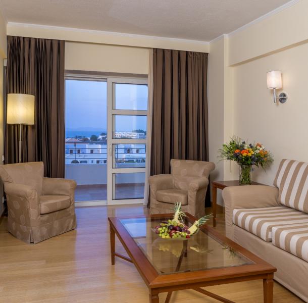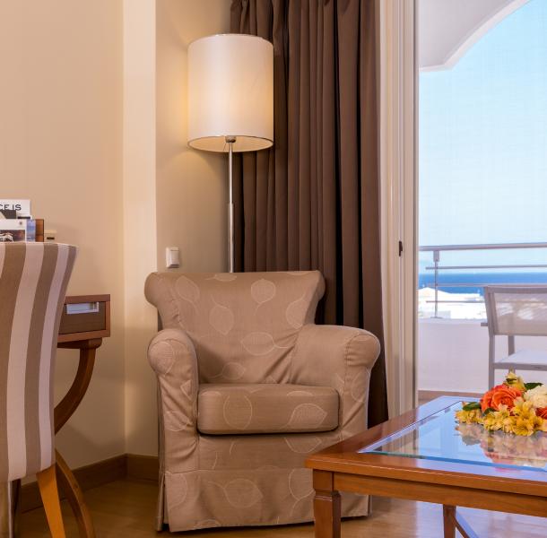 Yet this welcoming suite is just as inviting outside as it is inside. Its private balcony comes with lulling views over the verdant gardens – and in some cases, the sparkling Aegean Sea – and it is where you’ll enjoy long, leisurely moments – cocktail in hand and loved one(s) beside you.