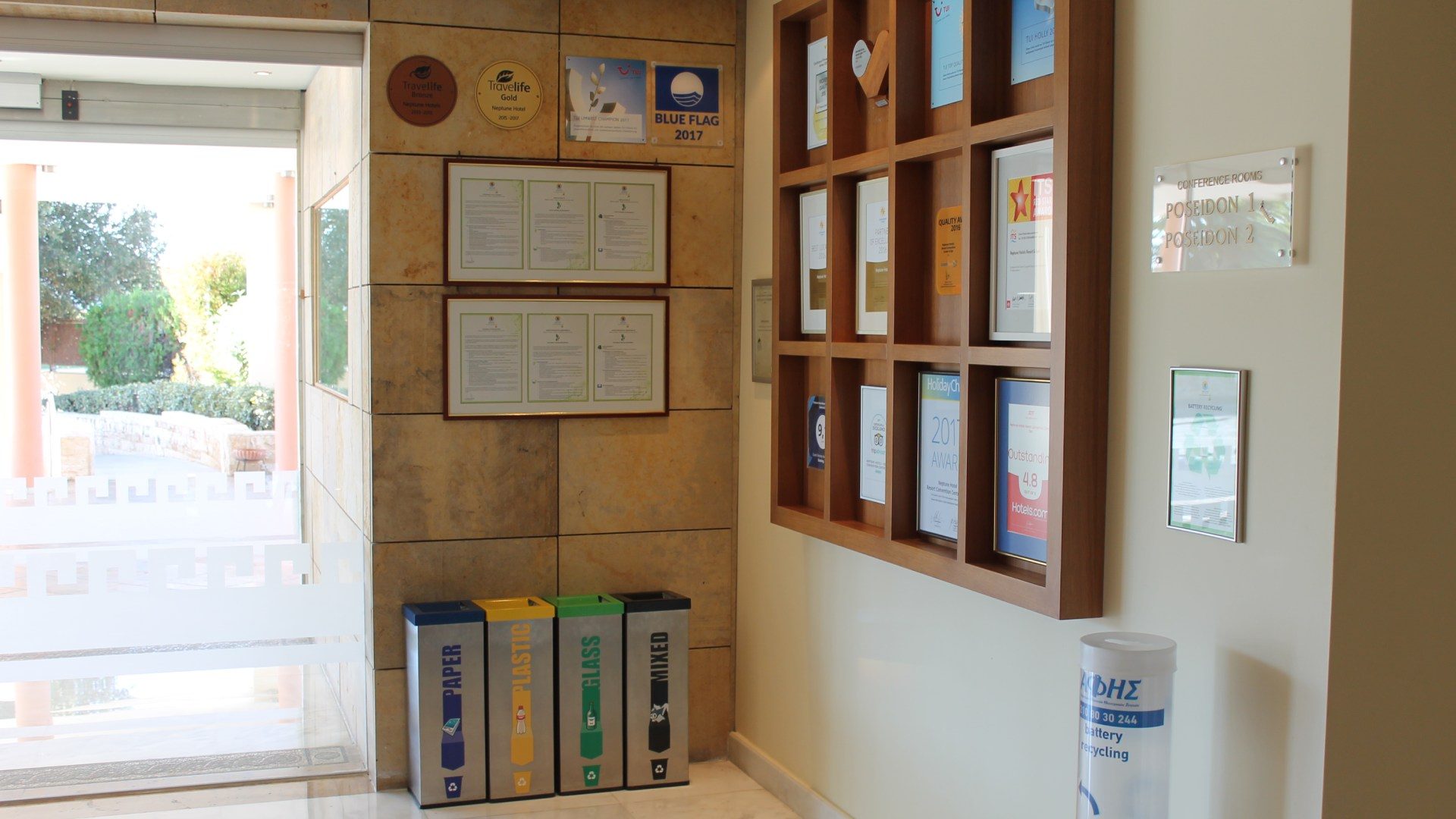Geschmackvolle Recycling-Mülleimer regen unsere Besucher an mehreren Stellen des Hotelgeländes an, unsere Bemühungen positiv zu unterstützen. Gleichzeitig sensibilisieren und motivieren wir unsere Mitarbeiter durch Schulungen, Seminare und Anweisungen sowie durch Anbringung von speziellen Mülleimern in allen Arbeitsbereichen zur korrekten Wiederverwertung.